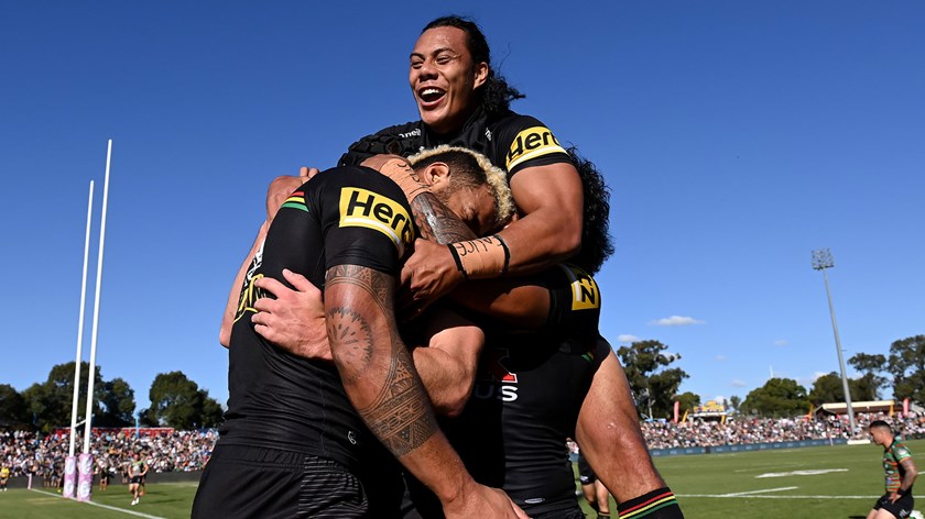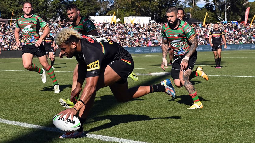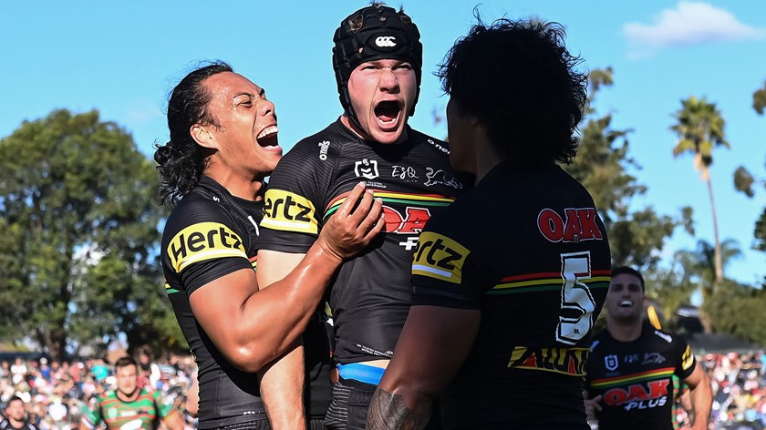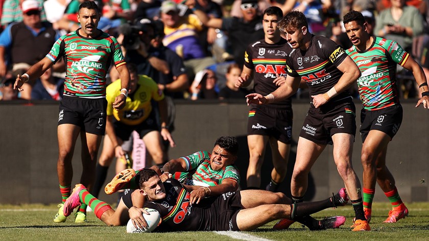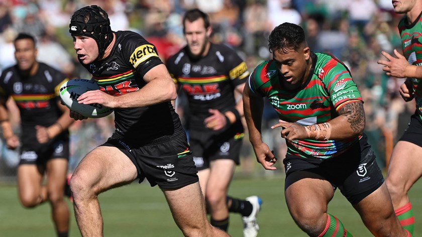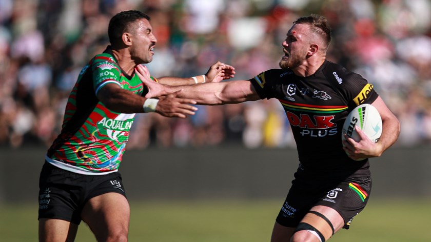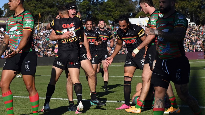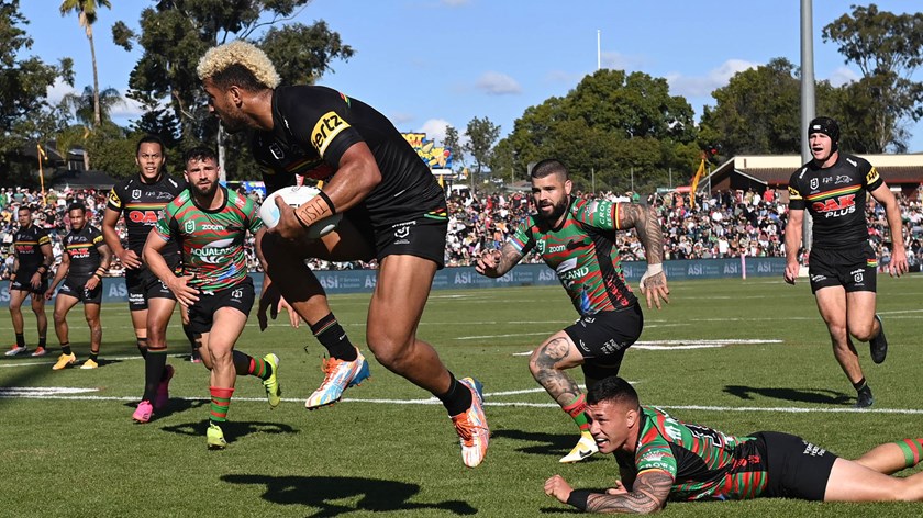 Matt Burton scored a hat-trick and Nathan Cleary collected a personal tally of 28 points (two tries and 10 goals) as the Panthers ran out 56-12 winners over the Rabbitohs at Apex Oval in Dubbo.