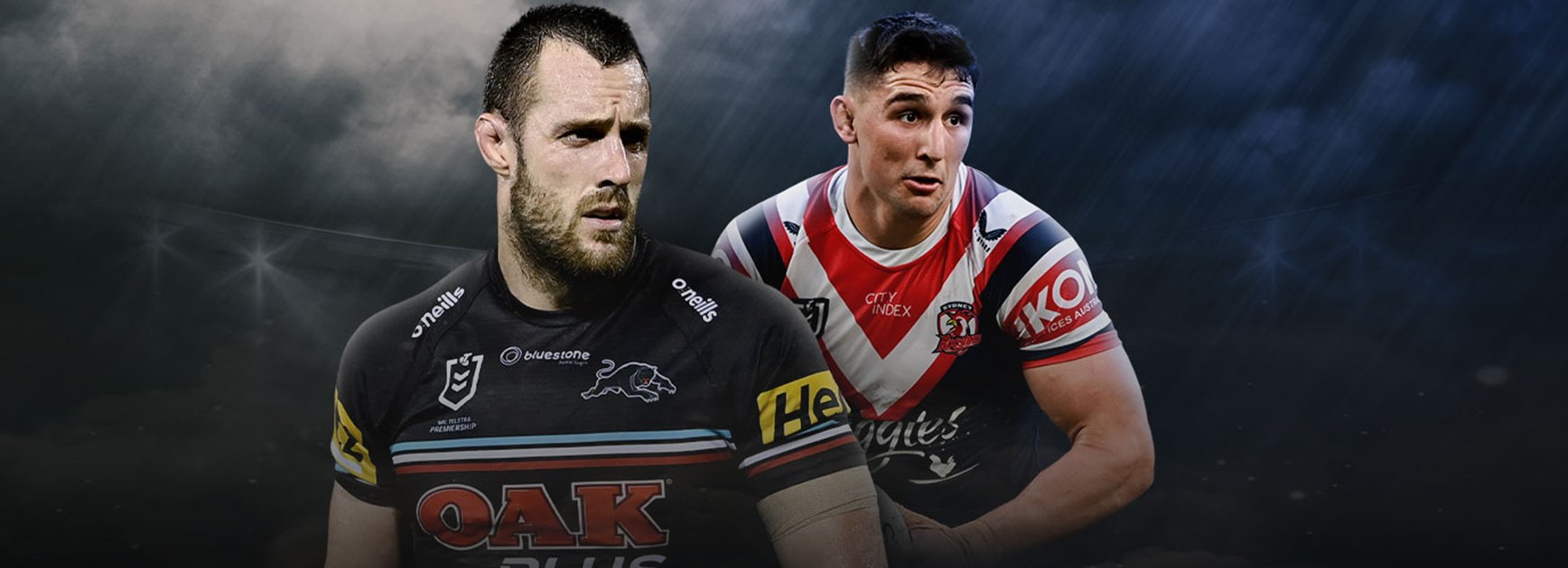 Prop for Panthers is number 8 Moses LeotaProp for Roosters is number 8 Jared Waerea-Hargreaves